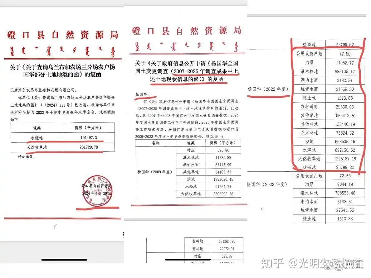 显示,2024年4月29日由磴口县天然资本局下发的《关于查询布兰布和农场三分场农户杨国华部门地盘地类的函》的复函中显示,2022年杨国华地盘地块只要两类,一类是水浇地,一类是天然牧草地。然而,正在一年后的2025年5月16日, 由统一家单元下发的《关于消息公开申请(杨国华全国地盘变动查询拜访2007年-2025年查询拜访中上述地盘现状消息的函)》的复函,记录了杨国华承包地块2009年-2023年度河山变动查询拜访数据,包含年度时间、地类、面积等消息。正在这个区间的所有地类中,此中2022年的地类很是复杂,不只是水浇地和天然牧草地,还包罗乔木林地、沙地、其他草地,湖泊水面、坑塘水面等等十四余种地类。