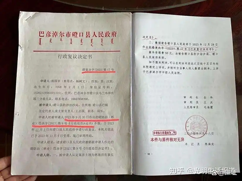 图说:磴复决字〔2023〕17号《行政复议决定书》及磴口县(2024)内0822行初2号。