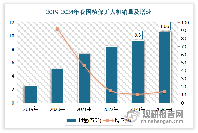 虽然近年我国聪慧农业获得了快速成长,研究及开辟已初具规模,尺度化手艺和使用过程也相对较为成熟。但对比全球市场,我国聪慧农业起步较晚,农业机械化、功课智能化程度远低于其他领先国度(如如高端农业传感、生命消息设备被美国、日本、等企业垄断,大马力高端智能配备较多依赖于进口,动动物发展模子取焦点数据次要来自美国、以色列、荷兰、日本等),市场照旧处于以示范项目指导的成长初期,市场空间广漠。从持久的角度来看,聪慧农业是处理我国生齿取地盘矛盾的主要径。按照国度计谋规划,农业出产运营数字化转型取得较着进展。数字手艺取农业财产系统、出产系统、运营系统融合,大田规模化种植、设备园艺尺度园、规模化生猪 / 蛋鸡 / 肉鸡 / 奶牛养殖场、水产健康养殖示范场率先实现数字化转型。到2035 年农业农村现代化根基实现,聪慧农业取得标记性进展,我国进入世界农业强国前列。聪慧农业的“新基建”、新理论、新配备、新产物、新业态取得冲破,自从立异能力和程度全面提拔,聪慧农业学科取立异团队达到国际一流程度。农业次要环节的数字化全面转向农业全财产链、全环节的数字化和收集化,批量建成少人化或无人化的聪慧农(牧、渔)场,根基建成“软件定义、数据驱动、配备支持、财产融合”的聪慧农业财产系统。农业传感器取测控终端、农业智能配备制制、农业软件等财产规模不竭强大,聪慧农业财产焦点合作力达到国际先辈程度。具体而言,估计大田、设备、畜禽、水产出产数字化程度别离达到 50%、70%、75%、75%,农业数字经济占第一财产 P 的比沉跨越 70%。植保无人机,是用于农林动物功课的无人驾驶飞机,该型无人飞机由飞翔平台(固定翼、曲升机、多轴飞翔器)、飞控、喷洒机构三部门构成,通过地面遥控或飞控,来实现喷洒功课,能够喷洒药剂、种子、粉剂等。近年跟着科技的飞速成长,植保无人机正成为农业范畴的抢手话题。做为现代农业手艺的新兴代表,植保无人机凭仗其经济、环保等劣势,逐步获得了泛博农人伴侣和农业企业的承认。按照数据,2023年我国植保无人机销量达9。3万架,较上年同比增加10。71%。估计2024年我国植保无人机销量达10。6万架,较上年同比增加13。98%。