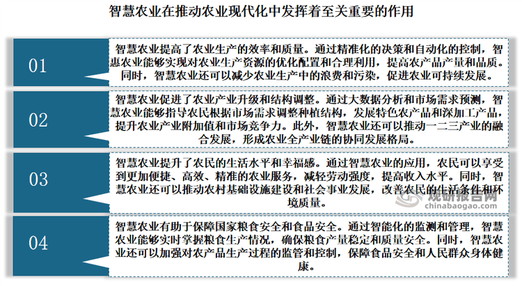 我国农业的根基现状是“大国小农”,农业财产成长仍然受限于农业从业人员匮乏、春秋老化、农业用地削减等问题。因而操纵高新手艺和互联网手艺成长聪慧农业,改变保守农业出产体例,是现代农业成长的必然趋向之一,以农业消息化和人工智能为根本的“聪慧农业”应运而生。正在此布景下,地方连续发布相关政策鞭策聪慧农业成长。例如地方网信办、农业农村部等10个部分结合发布了《数字村落成长步履打算(2022-2025年)》,此中明白提出了加速鞭策聪慧农业成长的聪慧农业立异成长步履。成长聪慧农业既是数字村落扶植的主要构成部门,也是破解我国三农问题、建立现代农业国际合作新劣势所亟需的。到目前我国正在聪慧农业范畴曾经根基成立了一套完整的政策系统,涵盖了从地方层面四处所的施行,从根本设备扶植到手艺推广使用和社会化办事。近年得益于我国全方位政策盈利支撑、财务投入不竭添加,我国聪慧农业市场快速成长。数据显示,2022年我国聪慧农业市场规模为868。63亿元,同比增加约26。81%。估计到2024年我国聪慧农业市场规模达到到1050亿元。