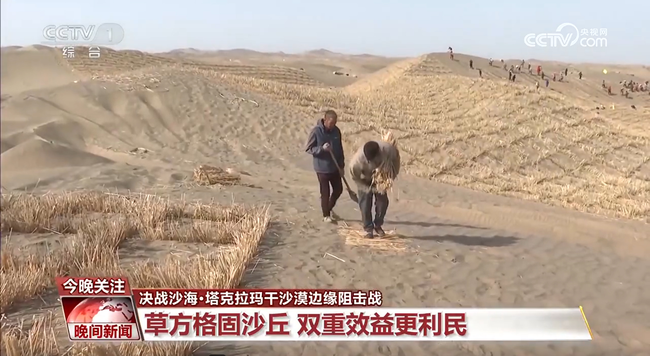 总台记者 刘飞飞:我现正在所正在的处所就是正正在进行锁边工程的现场。本地正在草方格的铺设上就试验了9种体例,