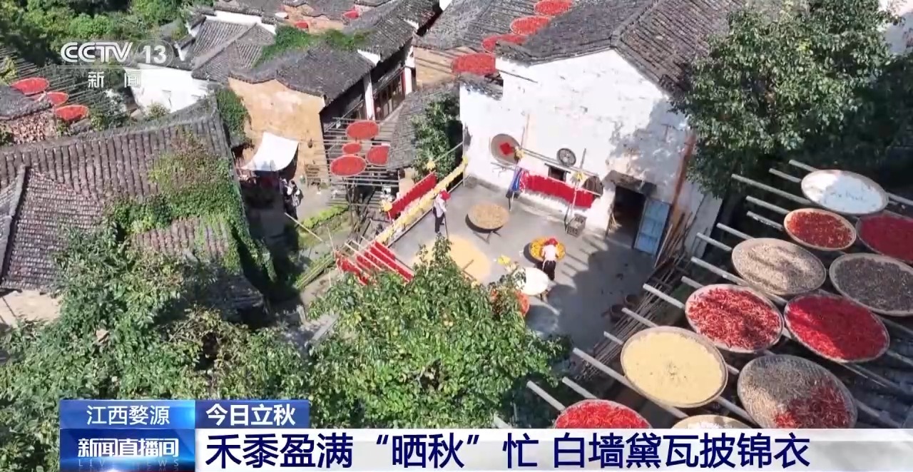 晓容村村平易近 黄桃花:我们白叟家就是说如许子“立秋吃粿汤 吃吃眼睛光”,就是吃了眼睛亮。秋季就是要吃粿汤了,新打出来的米更有养分。正在江西上饶婺源县,村平易近们操纵晴好气候,将刚收成的辣椒、玉米、晾晒正在自前屋后的晒架上,呈现出一幅斑斓的山村“晒秋图”。同时,跟着早稻的丰收,人们通过吃“粿汤”来庆贺丰收,秋天的空气逐步稠密。